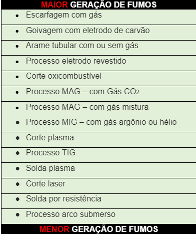 A tabela 1 informa os processos de soldagem que geram a maior e a menor quantidade de fumos. Mas, é importante destacar que os gases originadores, por não serem visíveis, são tão relevantes quanto os fumos em relação à nocividade para a saúde.